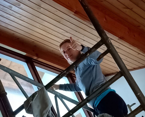 Met knikkende knieën zette ik de laatste stap op de ladder. In de afgelopen weken heb ik al meerdere keren op de steiger gestaan om de kozijnen in onze vier-en-een-halve meter hoge woonkamer op te schuren, schoon te maken en te schilderen,…